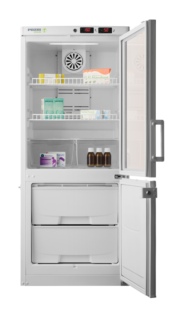 Предназначен для работы в лабораториях различных направлений и диагностических центрах (ПЦР, биохимические, иммунологические и гематологические исследования), на станциях переливания крови и в серологических лабораториях, при оснащении аптек, аптечных производственных отделений и фармацевтических предприятий, прививочных кабинетов и ветеринарных клиник. Холодильник обеспечивает потребность в хранении лекарственных препаратов, средств, образцов, тест-наборов и других фармацевтических средств при температуре от +2°С до +15°С в холодильной камере и при температурах от минус 10°С до минус 25°С в морозильной камере. Основные характеристики: 2 микропроцессорных регулятора температур со сверхчувствительными датчиками температуры, система принудительной циркуляции воздуха в холодильной камере, в холодильном отделении дверь стеклянная с замком, в морозильном отделении дверь металлическая с замком, автоматическое поддержание температуры в камерах, сигнализация при отклонении температуры от заданной, отображение температуры на табло панели управления, отключение вентилятора при открывании двери.